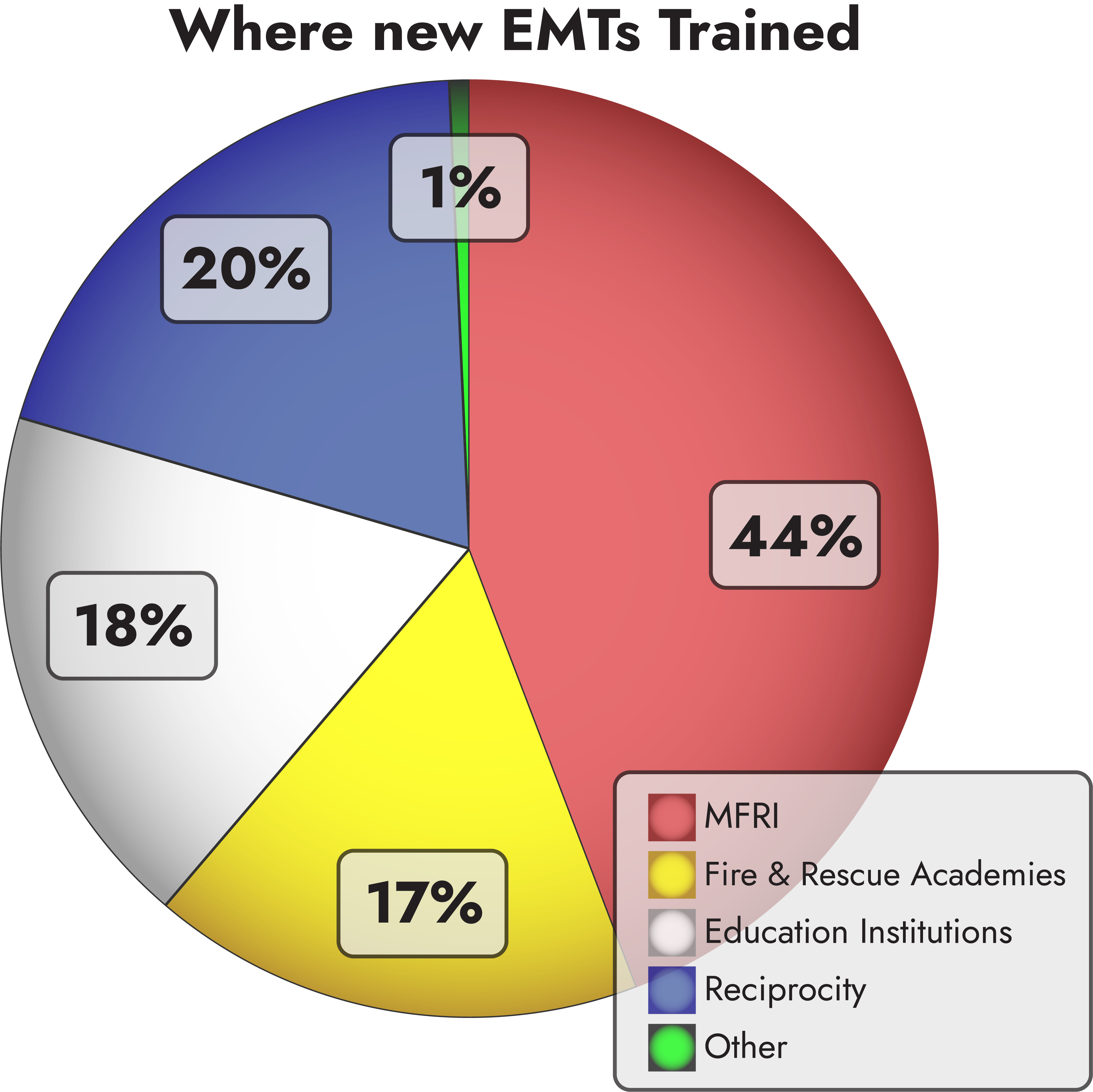 There are 45 educational programs across Maryland that provide Initial clinician education for EMS. These programs are approved by the State EMS Board, and include the University of Maryland Baltimore County, 13 community colleges, seven public safety training academies, and the Maryland Fire and Rescue Institute (MFRI). Initial Certification for EMS clinicians may be as an Emergency Medical Responder, Emergency Medical Technician, or Paramedic. In 2020, Maryland stopped issuing new Cardiac Rescue Technician certifications. Continuing education required for maintenance of certification and licensure is offered throughout the state over the course of each year through MFRI, various academies, educational programs, conferences, seminars, and the Online Training Center.