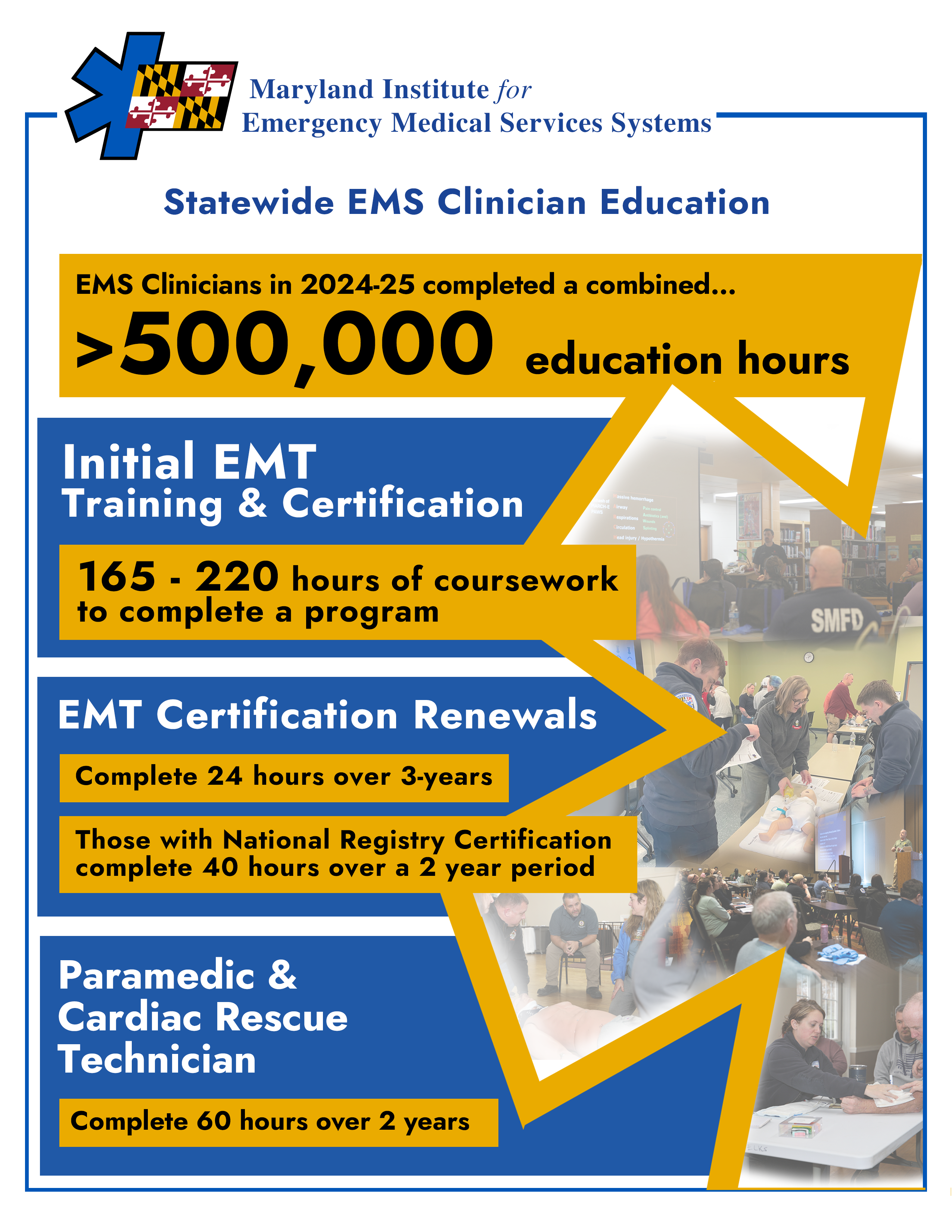 - Clinician Certification Renewal requires clinicians to complete continuing education to maintain competencies and technical skills. EMS clinicians must stay current with annual updates to The Maryland Medical Protocols for Emergency Medical Services. Training videos and online verification are developed by the State Office of the EMS Medical Director, Media Services, and Clinician Services, and EMS clinicians are required to complete their work in the Online Training Center to ensure consistent, evidencebased care delivery.