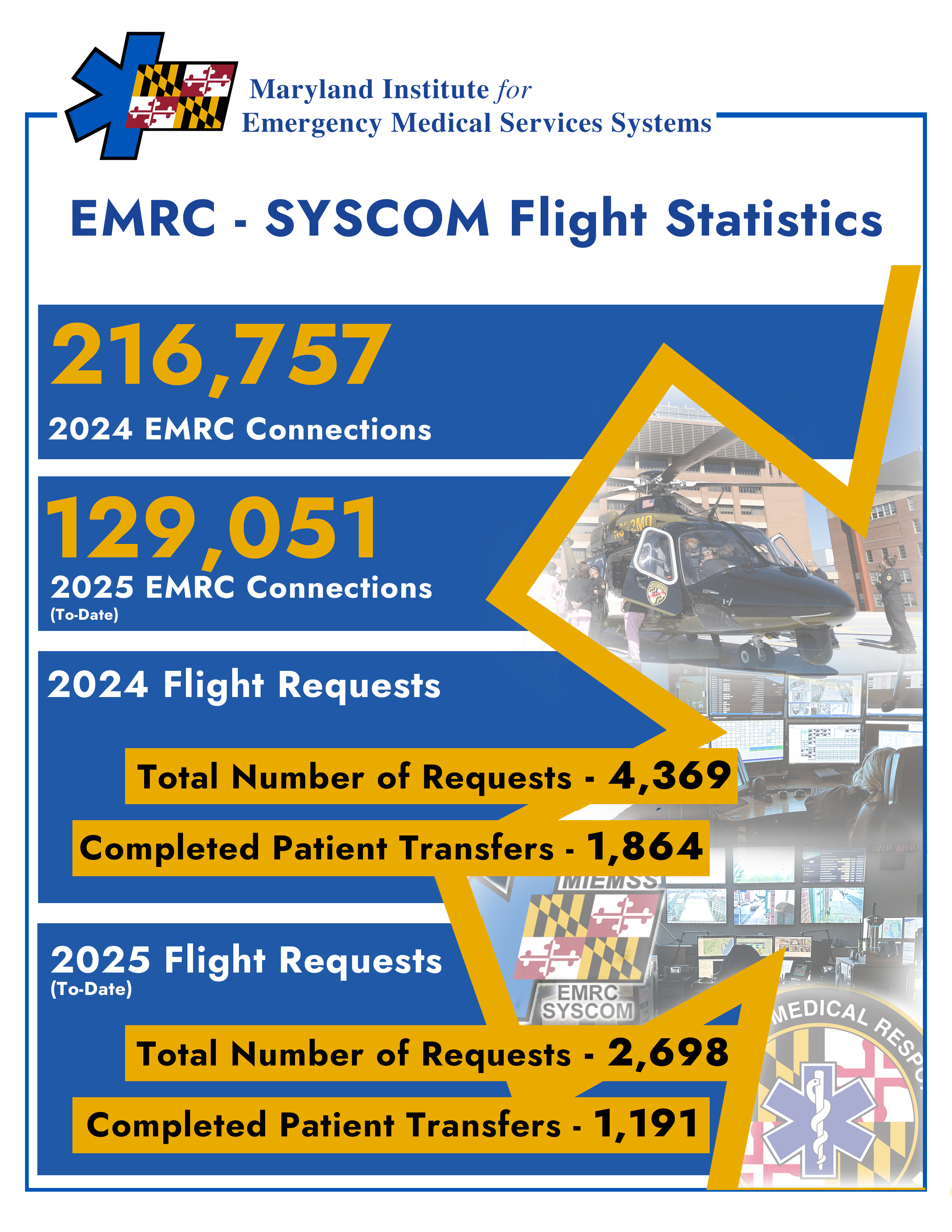 EMRC manages communications between prehospital emergency medical services clinicians and emergency departments, trauma centers, and specialty centers to facilitate medical consultations. During major medical incidents, the EMRC shares up-to-date situational awareness regarding the activities, capabilities, and capacities of hospitals and the prehospital system. The EMRC provides initial alerting, coordinates resources, and manages patient distribution This year, EMRC handled 216,757 telephone and radio calls. These calls included communications involving administrative/ operational support issues, single patients, incidents with multiple patients, and calls involving online medical direction. With integration of the Emergency Department Advisory System (EDAS) the center monitors and shares hospital status information with 911 centers, EMSOPs, MIEMSS officials and hospitals.