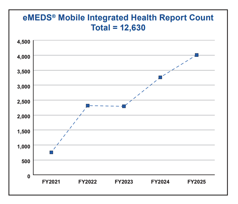 MIEMSS continues to support enhancements to the eMEDS® Mobile Integrated Health (MIH) module, developed in 2020, to improve data collection and guide future MIH efforts. As of the end of FY 2025, over 12,100 reports have been recorded using the MIH module. Starting in FY 2024, MIEMSS began working with CRISP to export MIH data to the state’s designated health information exchange.
