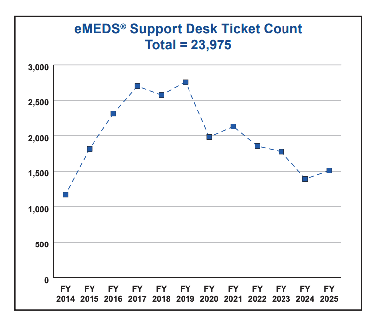 eMEDS® Support Desk (emeds-support@miemss.org) The eMEDS® application includes a MIEMSS support desk that handles requests from EMS clinicians, EMS Operational Program (EMSOP) administrators, and healthcare facility personnel across the state. Common issues include password resets, login problems, access level questions, report writer functionality, EMSOP integrations, and general application inquiries. During FY 2025, the support desk processed over 1,500 support tickets.