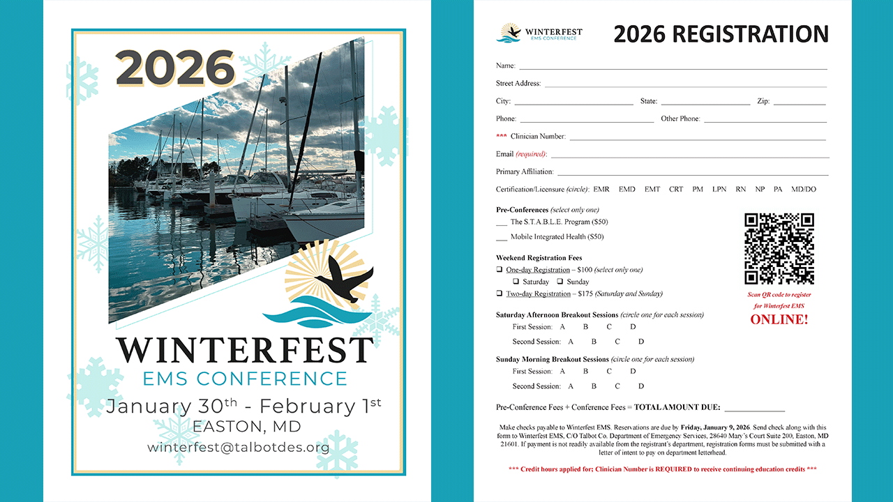 The Winterfest EMS Conference will be held in Easton, MD from 1/30–2/1. View the conference page here for more information or download/print the program and registration form to sign up.